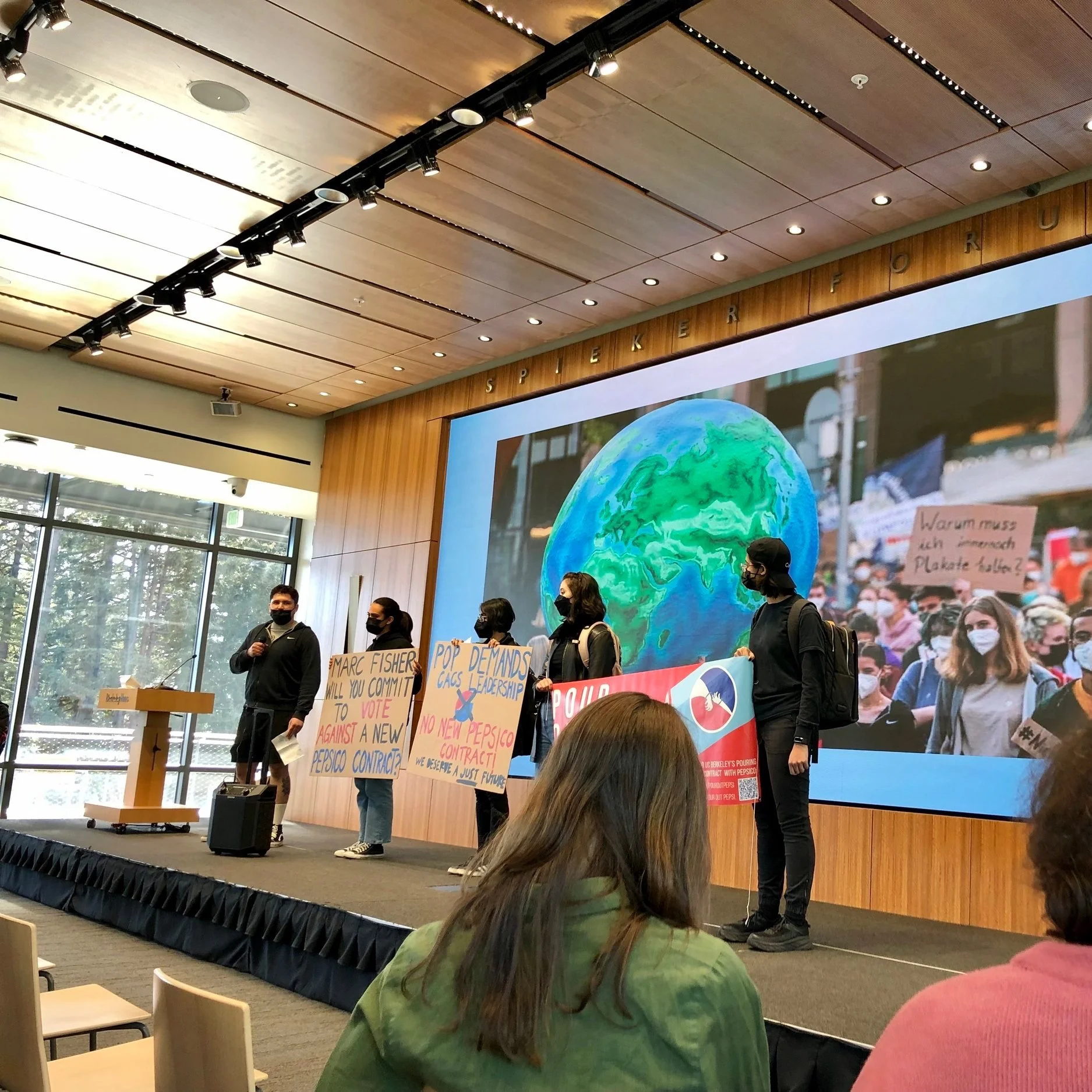 After the keynote speaker, chants erupted from the back of the room, “hey ho, hey ho, PepsiCo has got to go!” Protesters from the Pour Out Pepsi campaign came on stage and asked two UC Berkeley administrators of the University Partnership Program (UPP) Advisory Committee, Vice Chancellor of Administration Marc Fisher and Chief Financial Officer Rosemarie Rae, to commit to not renewing the school’s contract with Pepsi due to environmental and social justice concerns. Ironically, the next speaker was Marc Fisher. Fisher did not commit to voting “no” for Pour Out Pepsi, and instead talked about how complex such a decision was and the consideration to “change the industry” working alongside it. He also asked students to ask lawmakers in Sacramento to secure funding for UC Berkeley to transition from its on-campus natural gas plant to majority renewable electricity. Following his remarks, sustainability awards were presented to students and staff. The event concluded with a climate justice tour along Strawberry Creek.